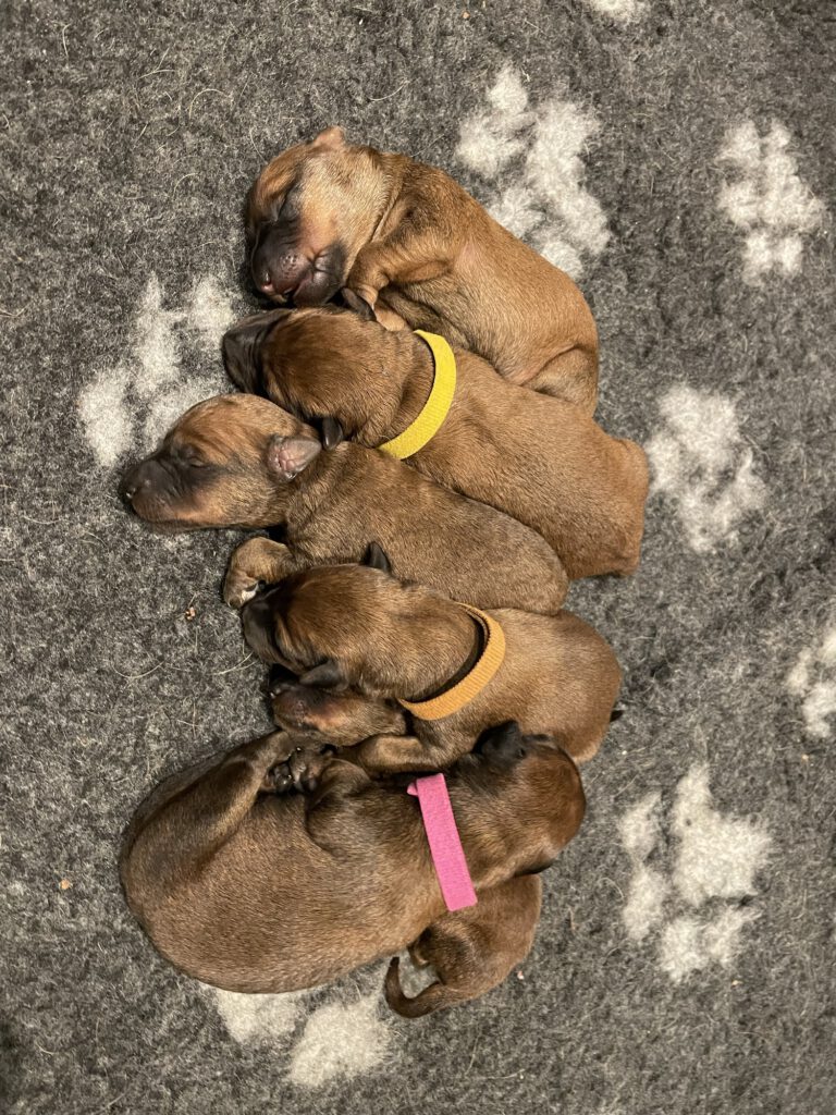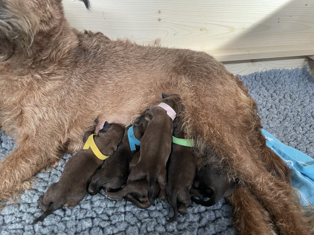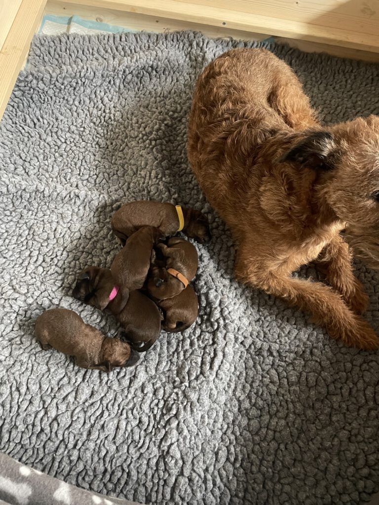 Am Montag den 16. Februar 2026 hat unsere Ruby 6 kleine Irish Terrier Welpen bekommen. Wir freuen uns über 2 Hündinnen und 4 Rüden! Den Kleinen geht es wunderbar und wir könnten uns gar nicht mehr satt sehen. Es ist einfach zu niedlich! Das ein oder andere Halsband wurde auch schon immer wieder ausgezogen. Zum Glück können wir die Kleinen schon auseinander halten ; )